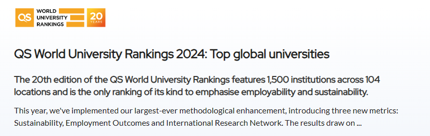 他来了他来了,他带着排名走来了! 众所周知,QS世界大学排名2024年的排名指标已经更改!这直接造成世界大学排名的大洗牌! 2023年,排名有6个指标:学术声誉占比40%:雇主声誉占比10%:单位教员论文引用数量20%,师生比例占比20%,国际教师比例5%留学生比例5%。还有两项指标 “国际研究网络,(International Research Network) 和“就业成果”(Employment outcomes)在2023年是不计入综合评分的,但是每个大学也会统计这项数据。 不过变化就在于2024年,这两项指标和可持续性 (Sustainability)这三个指标也将被计入综合评分,最新的综合评分指标如下: 学术声誉 (Academic Reputation):占比30%,下降10%; 雇主声誉 (Employer Reputation):占比15%,上升5%; 单位教员论文引用数 (Citations per Faculty):占比20%,不变; 师生比例 (Faculty Student Ratio):占比10%,下降10%; 国际教师比例 (International Faculty Ratio):占比5%,不变; 留学生比例 (International Student Ratia):占比5%,不变; 国际研究网络 (International Research Network):占比5% 就业成果 (Employment Outcomes):占比5%, 可持续性 (Sustainability):占比5% 从整体看来,上榜Top100大学数量前三的分别是美国27所、英国17所、中国11所。紧随其后的就是澳大利亚、韩国、德国、日本、法国、加拿大、瑞士这些国家。而由于今年排名指标的变化,TOP10的高校名单整体与去年有一些变化。共有4所英国大学,4所美国大学,以及瑞士和新加坡各1所大学上榜。 本次排名中变化十分明显的就是澳洲的大学,甚至可以说是本次排名标准改革的大赢家,不仅澳洲八大全部进入世界前一百,悉尼科技大学奋起直追也进入世界百强圈,排名世界90名。 在前一百名中,墨尔本大学从33名跑到了第14名,成为澳洲排名第一的院校。曾经的悉尼新南威尔士大学排名在40名开外,如今摇身一变,和悉尼大学并列世界第19名! 澳国立大学排名第34名。蒙纳士大学和昆士兰大学排在42和43,纷纷跻身前50名院校行列。西澳大学上升至72名,阿德莱德大学进入世界前一百,排在第89名。 话不多说,先上排名: 虽然前100排名学校变化比较大,但是咱们真正要做的就是从这个排名中找到我们双申或者将来要申请的国家/地区院校,而排名只是我们选校路上的一个参考而已,大家理性看待哦~