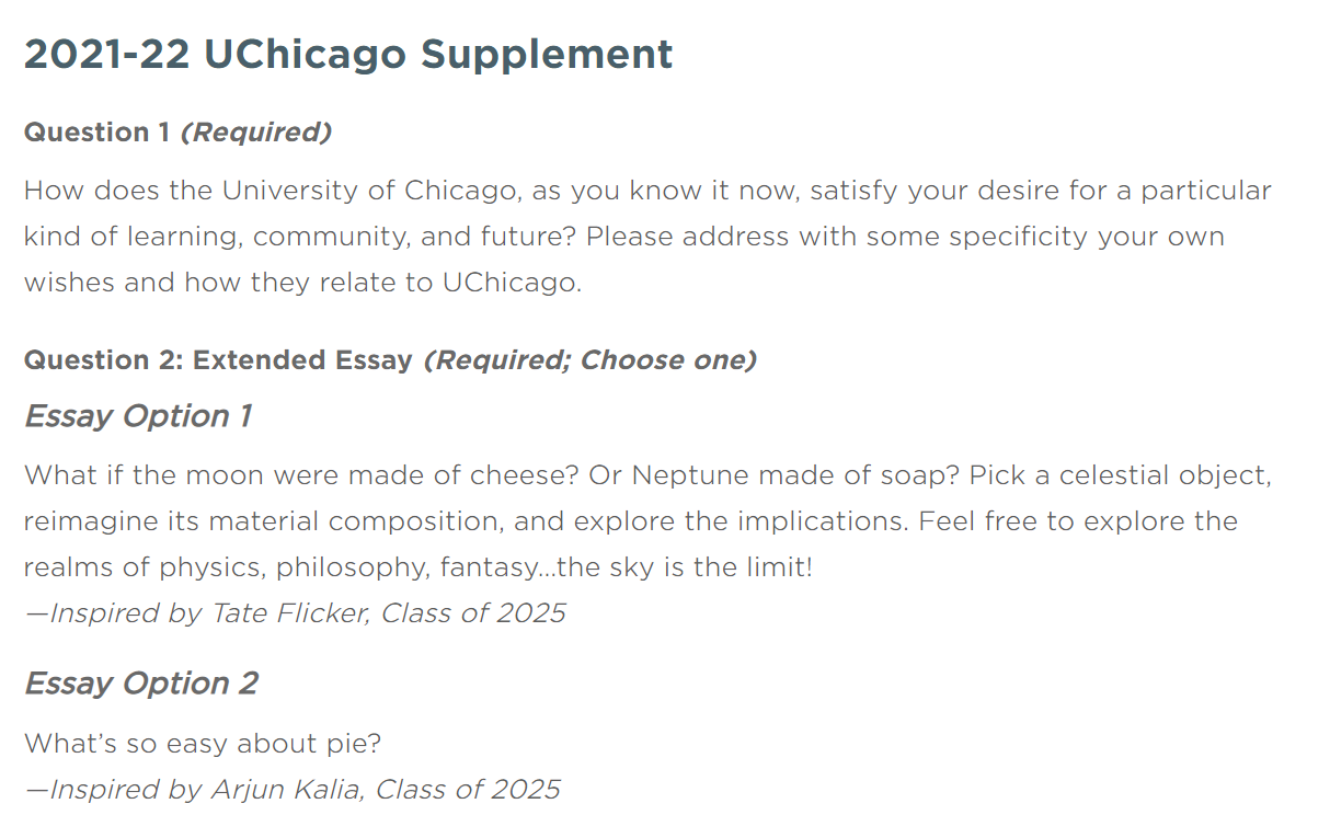 更进一步的要求会具体到why school,why major,这一类题目就是学校考察申请人对学校了解度的了。以芝加哥大学今年的文书为例: