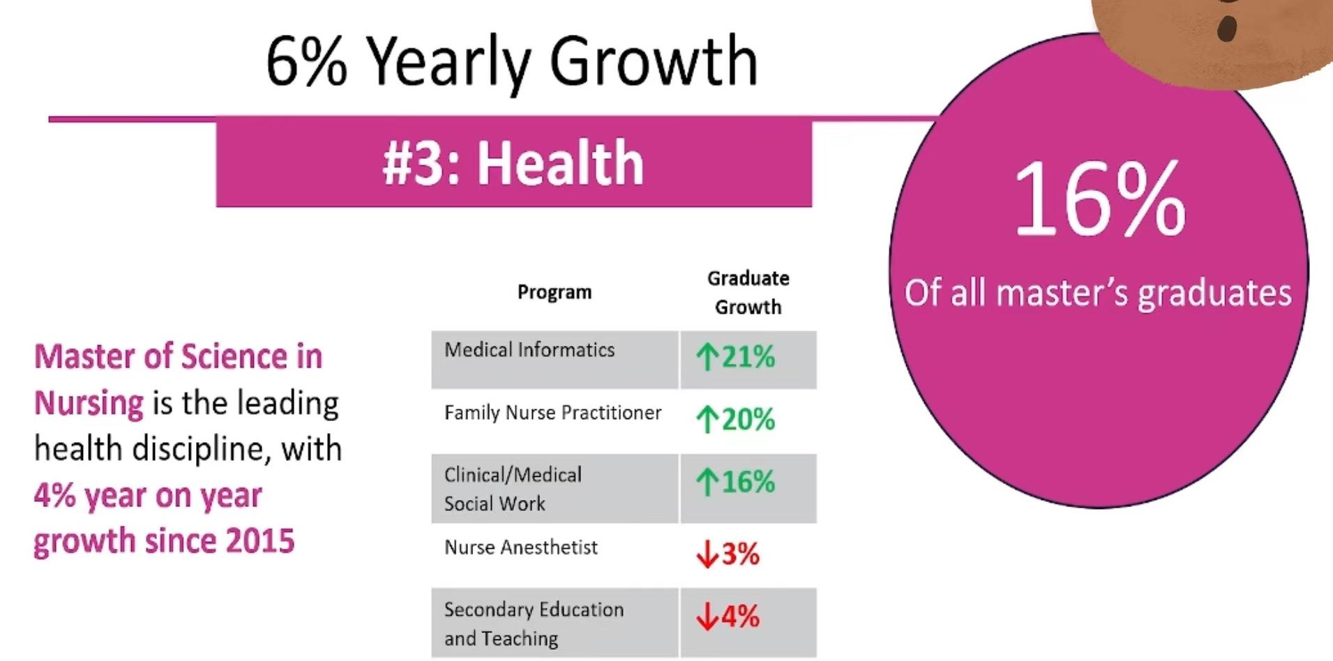 在疫情侵袭下,健康学专业的就读率以每年6%的增长率稳步上升。其中护理专业的增长率从2015年开始就以每年4%的速度稳定上扬。健康学内的细分专业里,因为疫情原因医学信息、临床社会工作、家庭护理等专业增速明显。